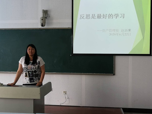 赵新荣老师做题为反思是最好的学习故事分享。她在总务处11年、资产管理处1年的工作中,始终服从安排,兢兢业业工作,与学校共同成长。同时,她也反思了签官僚字”“验收工作被动”数据核对不担当”等工作中的失误,交流了从中得到感悟。她表示:在今后的工作中,一定要增强服务意识,敬畏制度,牢记职责,勇于承担,做到“当日事、当日毕”,高效率完成工作任务。