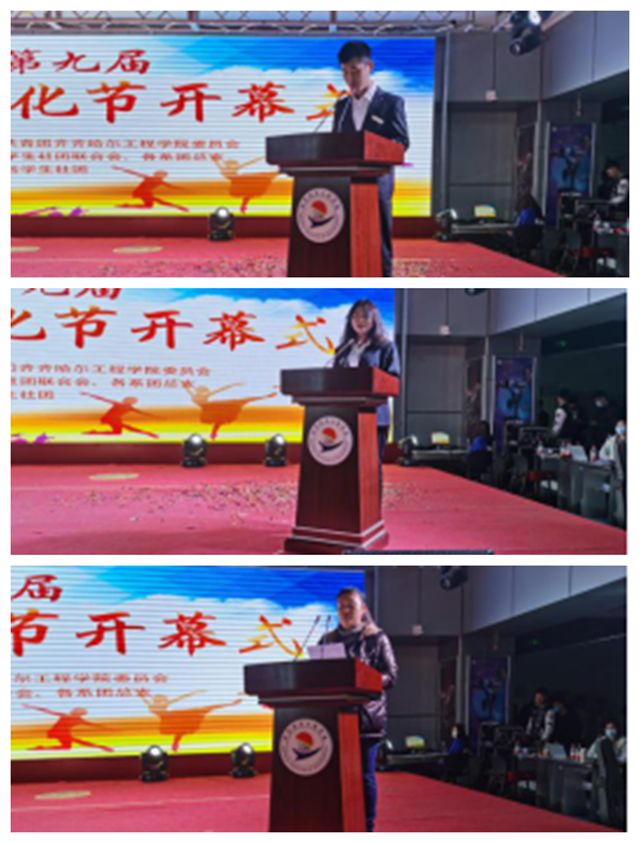 开幕式上,学工处副处长郭明敬宣读了《关于举办齐齐哈尔工程学院第九届社团文化节的通知》,学生社团联合会主席贾犇在发言中表示,要继续充分发挥社团的作用,努力打造精品活动和社团品牌,通过开展社团活动,培养兴趣、锻炼能力、陶冶情操。大学生心理发展协会会长姜岩代表优秀社团发言,她表示一定会珍惜学校提供的展示平台,同心协力构建一个和谐、繁荣、共进的社团大家庭。市书协副秘书长朱毅江亲笔题字“社团超市”,表达了对我校社团活动的期待与厚望。