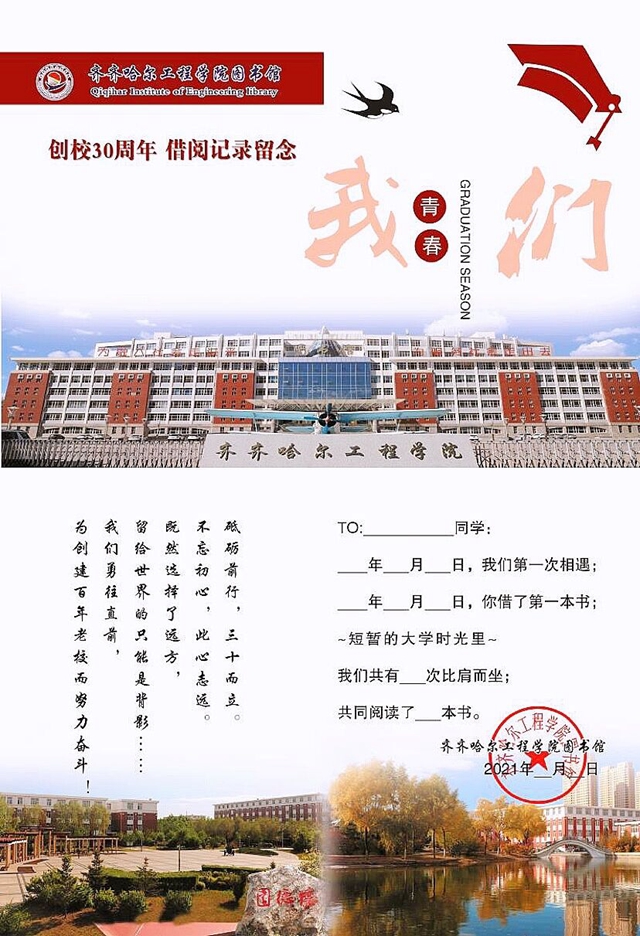 创校30年,是岁月的积淀,更是文化的传承。无数莘莘学子在齐工程这片沃土上,以青春之我书写我之青春。图书馆一直默默的陪伴着见证着每一位的成长。你是否记得那天你第一次来图书馆?你是否记得有哪一本书是你一次次阅读、留在手中直到必须归还?你是否记得有多少次你在书海徜徉,偶尔也幻想着一场邂逅?也许你都不记得了,但图书馆记得。此次活动虽然只是简单的展览与记录,但字里行间却饱含记忆,希望能够借此唤起每一位师生重温学校30年辉煌的历程。