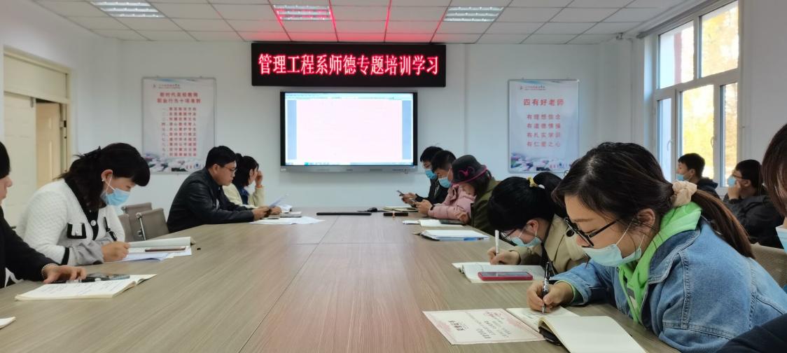 10月12日下午,在二号教学区2209会议室,管理工程系开展师德师风专题培训会。张洪岩副主任组织全体教职工深入学习《齐齐哈尔工程学院教师师德失范行为督查及处理办法(试行)》文件精神,要求教职工从教育教学、学术道德、等方面加强师德师风建设。王丹主任强调,教师在工作中严格要求自己,不能有师德失范行为。通过此次学习全体教职工表示,在今后的工作中,要时刻谨记学高为师,身正为范,坚守教育初心,勇担育人使命,不辜负家长和学生的期望。