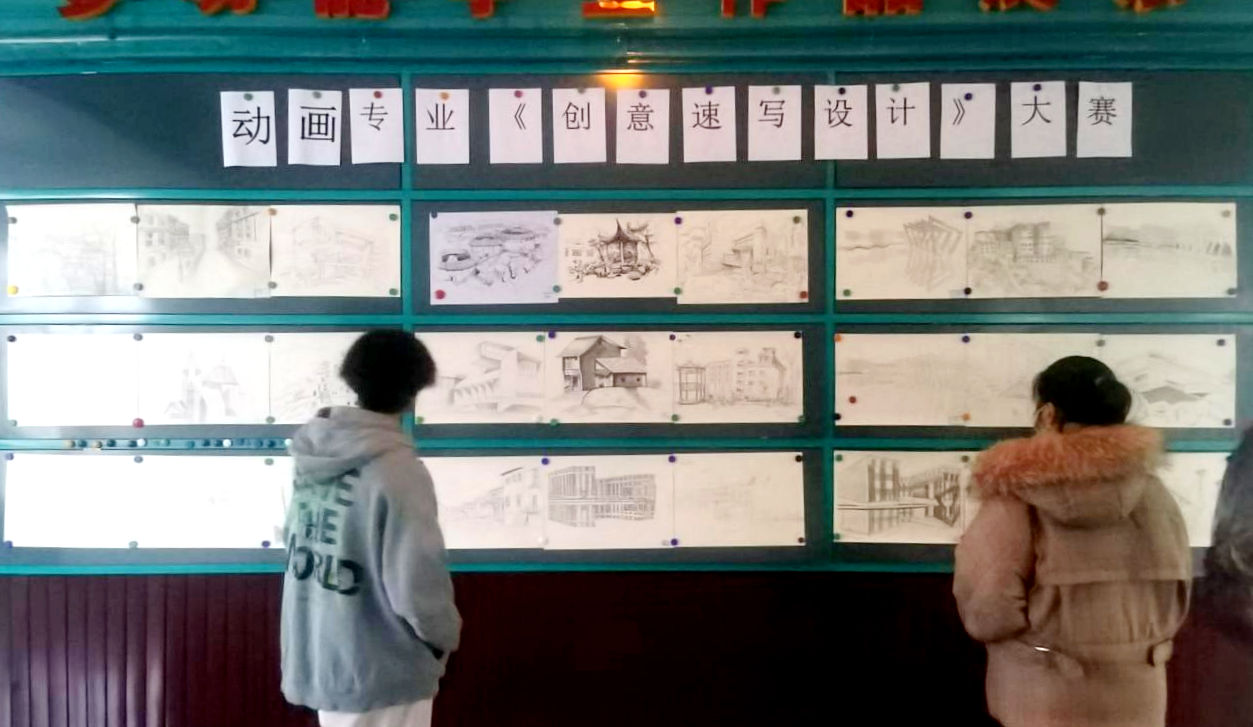1221日中午,信息工程系动画专业在一号教学区四楼A区举办创意速写设计课程作品大赛展,展出动画专业2020级学生校园风景速写作品27幅。