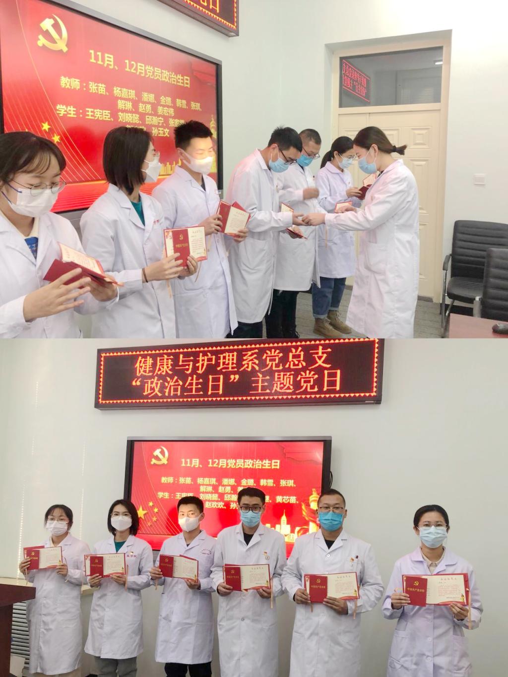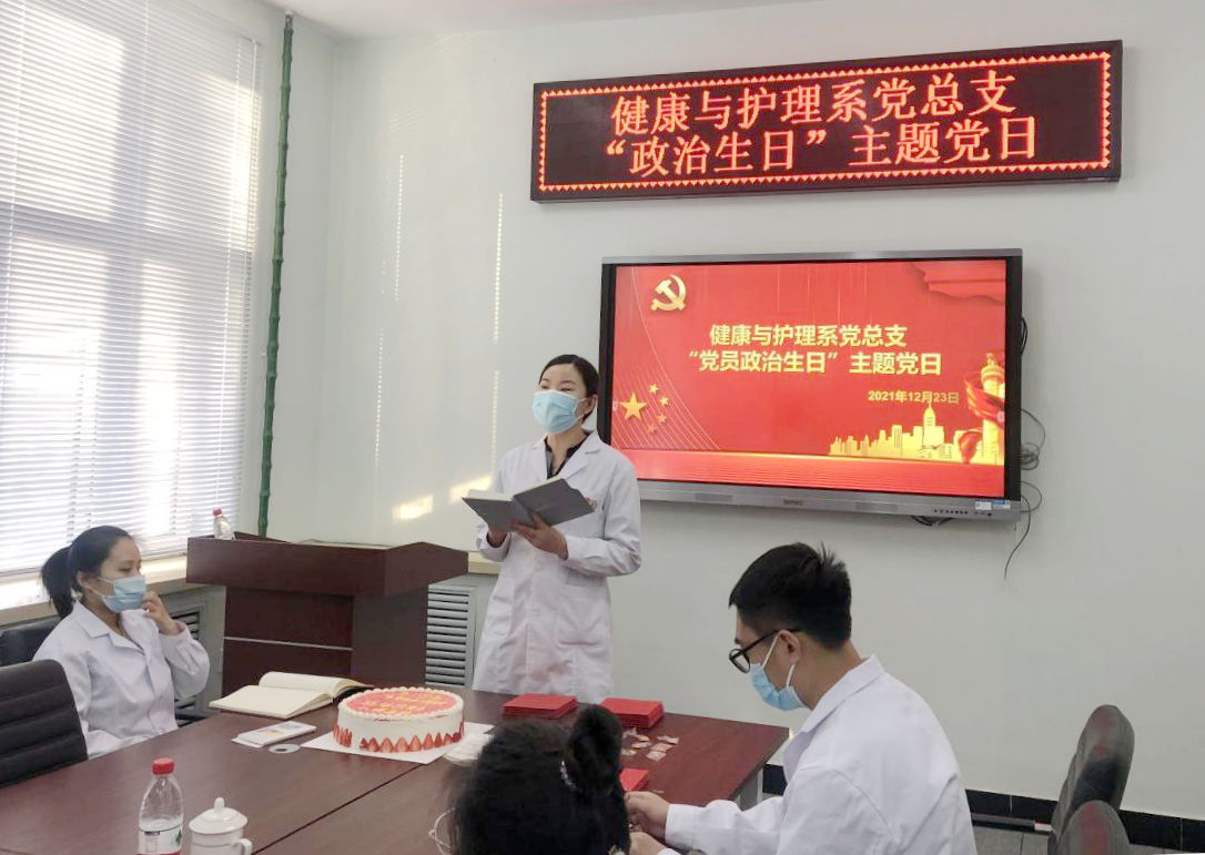 12月23日下午,健康与护理系党总支组织11月、12月入党的16名党员师生在一号教学区2104室共同过“政治生日”。