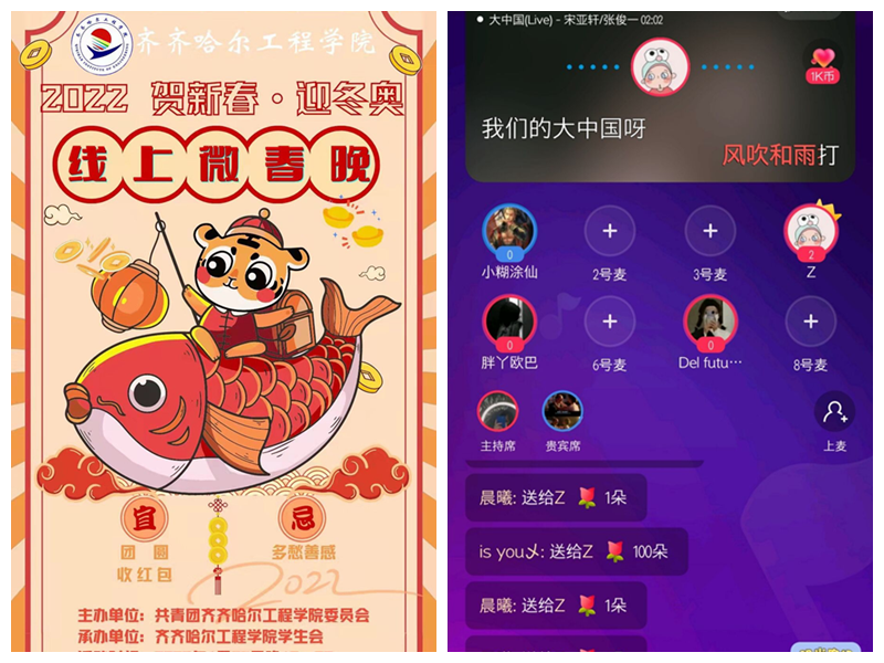 笑语欢歌辞旧岁,喜庆祥和迎新春。1月25日晚,校团委组织的以贺新春·迎冬奥为主题的线上微春晚在全民k歌直播间成功举办,本次活动旨在丰富学生的假期文化生活,营造欢乐祥和的新春佳节氛围,校团委学生会指导老师、各系学生及亲友团参加此次活动。