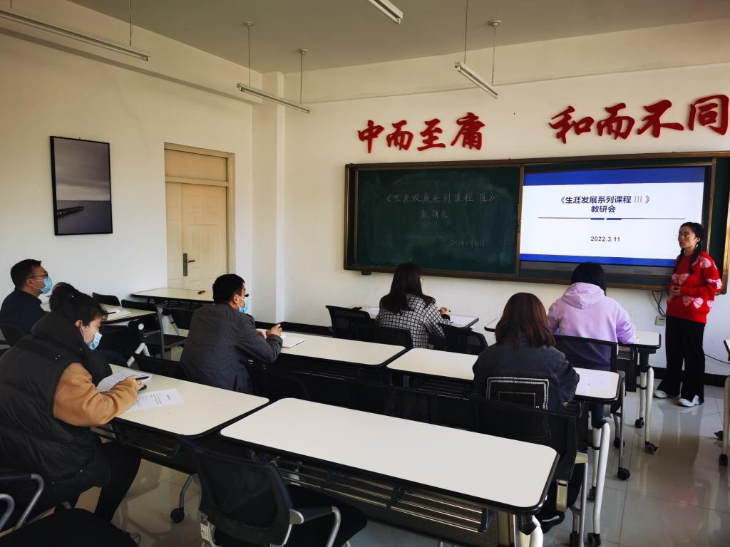 为提升教学水平,高质量完成《生涯发展系列课程Ⅲ》的课程任务,3月11日下午,学生发展中心组织2021-2022学年第二学期集体备课,8位担任主讲及助课教师参加,彭欢欢老师主持活动。