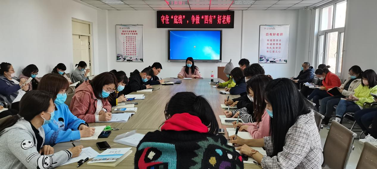 于红岩带领教职工深入学习《教育部“六禁令”》《高教教师师德“红七条”》《高等学校在职教师从业行为“十禁止”》《教育部公开曝光第八批8起违反教师职业行为十项准则典型案例》等文件,她要求各位教职工要守住“底线”、不碰“红线”,坚定为党育人、为国育才,牢记初心使命,争做“四有”好老师。