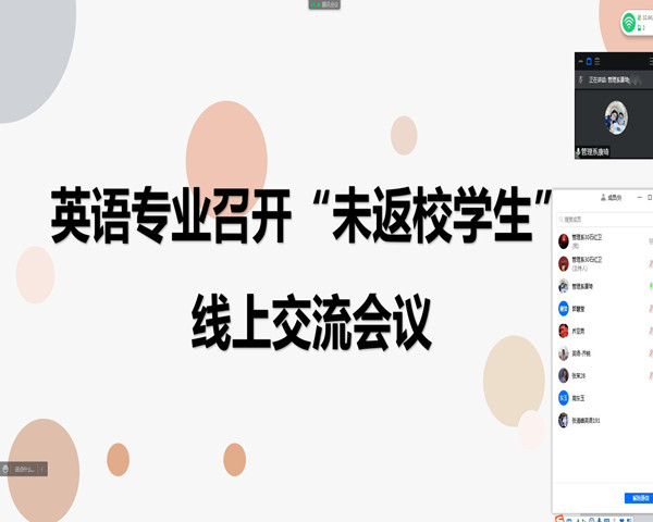 4月7日中午,英语专业为了解未返校学生情况,帮助他们解决学习方面的困难,召开了“未返校学生”线上交流会,英语专业教师及生涯导师参会,专业长康琦主持。