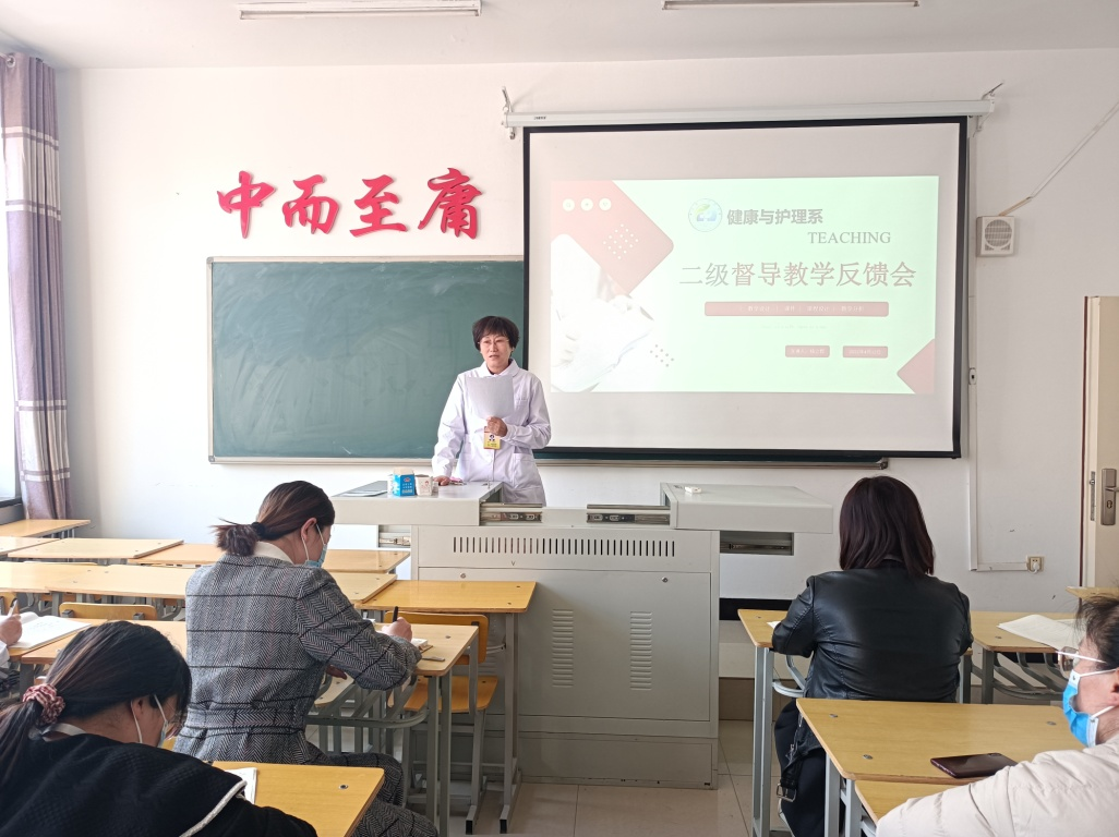 4月12日下午,健康与护理系在一号教学区1213教室组织召开二级督导教学反馈会。二级督导小组组长、系教学指导专家杨立群教授主持,二级督导小组成员系教学副主任张苗、健康服务与管理专业带头人杜红梅及系全体任课教师(含兼课教师)参会。