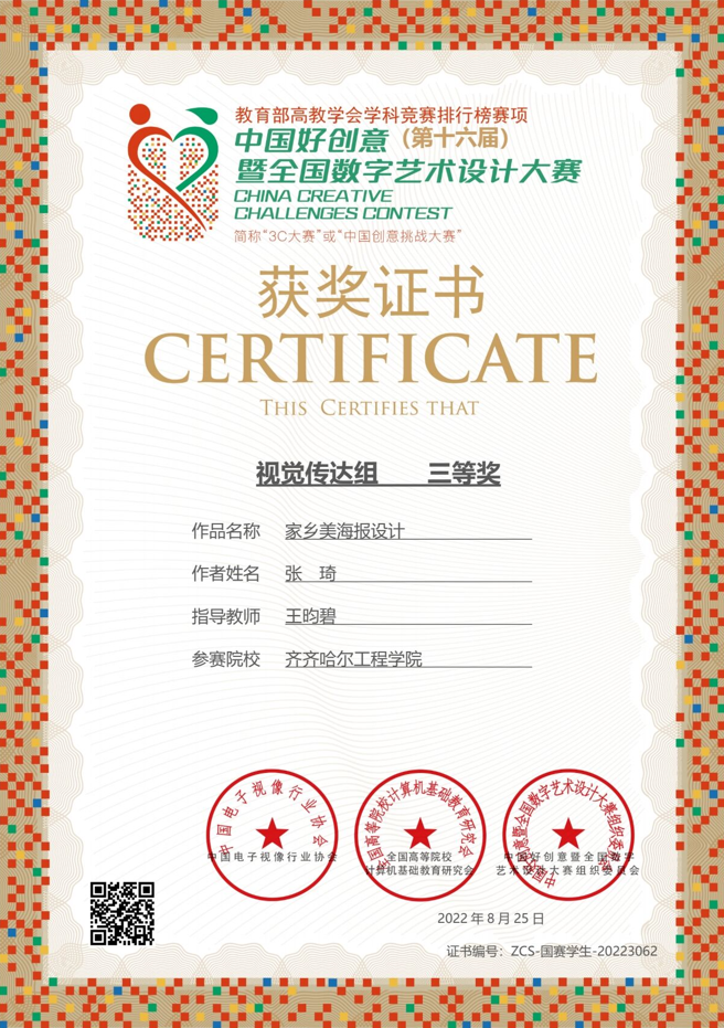 近日,由中国好创意暨全国数字艺术设计大赛黑龙江赛区评审会举办的第十六届中国好创意暨全国数字艺术设计获奖名单揭晓。我校11名同学获奖,其中张琦同学参赛作品获国赛推优;于杭同学获省级二等奖;于杭、褚徳金、郭艳丽同学获省级三等奖;何欣彤、王璐璐、陈玲、宋易、马秋杰、于杭、褚徳金、赵心男、乐文浩同学获省级优秀奖;我校荣获优秀组织奖。