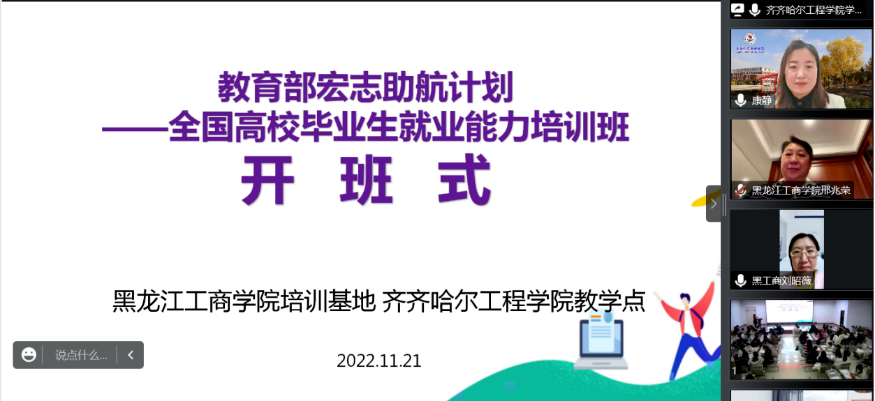 11月21日晚,2022年“宏志助航计划”培训班在二号教学区2508室开班,宏志助航计划就业能力培训基地代表、黑龙江工商学院校长助理邢兆荣,副院长张振笋,黑龙江工商学院大学生就业指导服务中心主任高洪,学生发展中心负责人康静、培训导师及参训的106名学生参加。会议由生涯教研室课程长逯娅娜主持。