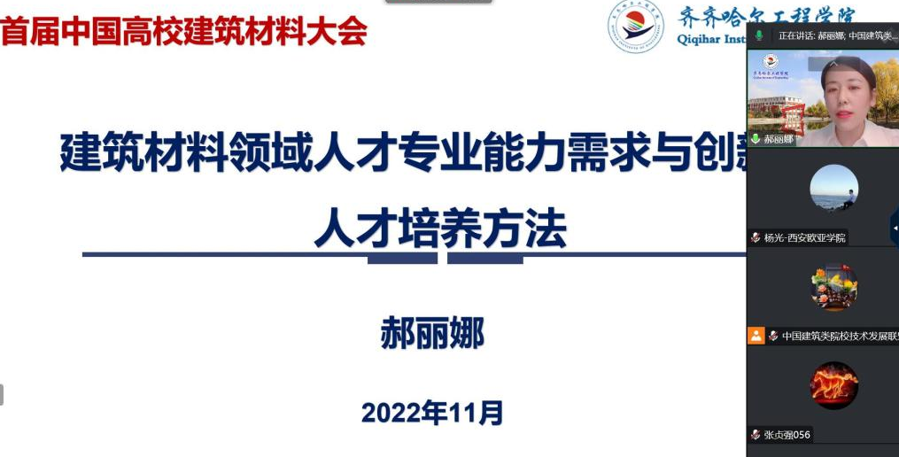 11月26日至27日,首届中国高校建筑材料大会之双碳与建筑工业化背景下——新型建材技术与施工工艺和人才培养峰会线上召开。建筑工程系教师郝丽娜受邀参加会议,分别做了题为《建筑材料领域人才专业能力需求与创新型人才培养方法》《土木工程材料课程教学改革与课题研究和申报讲解》的精彩报告。峰会由中国建筑类院校技术发展联盟主办,中国高校建筑材料大会组委会协办。
