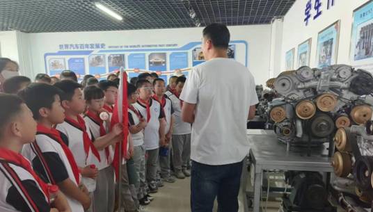 在汽车工程实验中心,孩子们了解汽车的运行原理,观看汽车发动机、底盘等零部件的内部结构,增长知识。