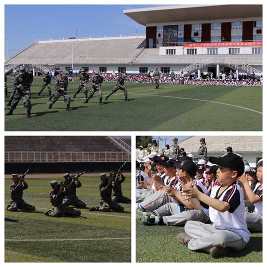 在体育场,孩子们观看了教官团的队列、军体拳、擒敌拳、匕首操、刺杀操展演,并热烈鼓掌。