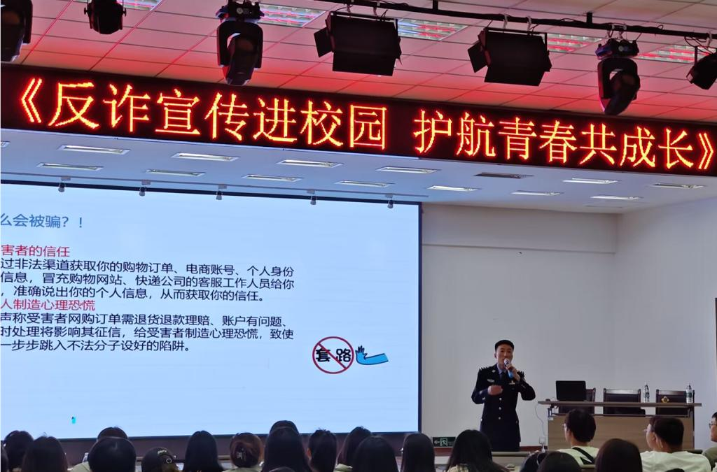 在“反诈宣传进校园 护航青春共成长”主题宣讲中,樊心亮民警结合真实事例,将电信网络诈骗常用手段与日常预防等内容,用通俗易懂的语言讲给学生,并向学生揭露了刷单返利,以及冒充电商物流客服、虚假购物服务、电子游戏充值刷单等高发电信诈骗案件的犯罪特点。