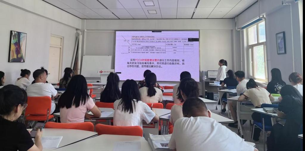 管理工程系刘天缘老师以《我与专业实践学期》为题,详细介绍了互联网金融专业的岗位分布情况,并采用PDCA时间管理法理念进行工作内容规划,将学生每天的实习任务填写表中,对其进行自我评价,找出存在问题,进而提出解决办法。刘老师对学生实习的内容及结果进行了展示,将专业实践学期分为前期、中期和后期三部分,她认为专业实践学期是将理论知识应用于实践的最佳方式,可以让学生在实践中学习到很多知识和技能。