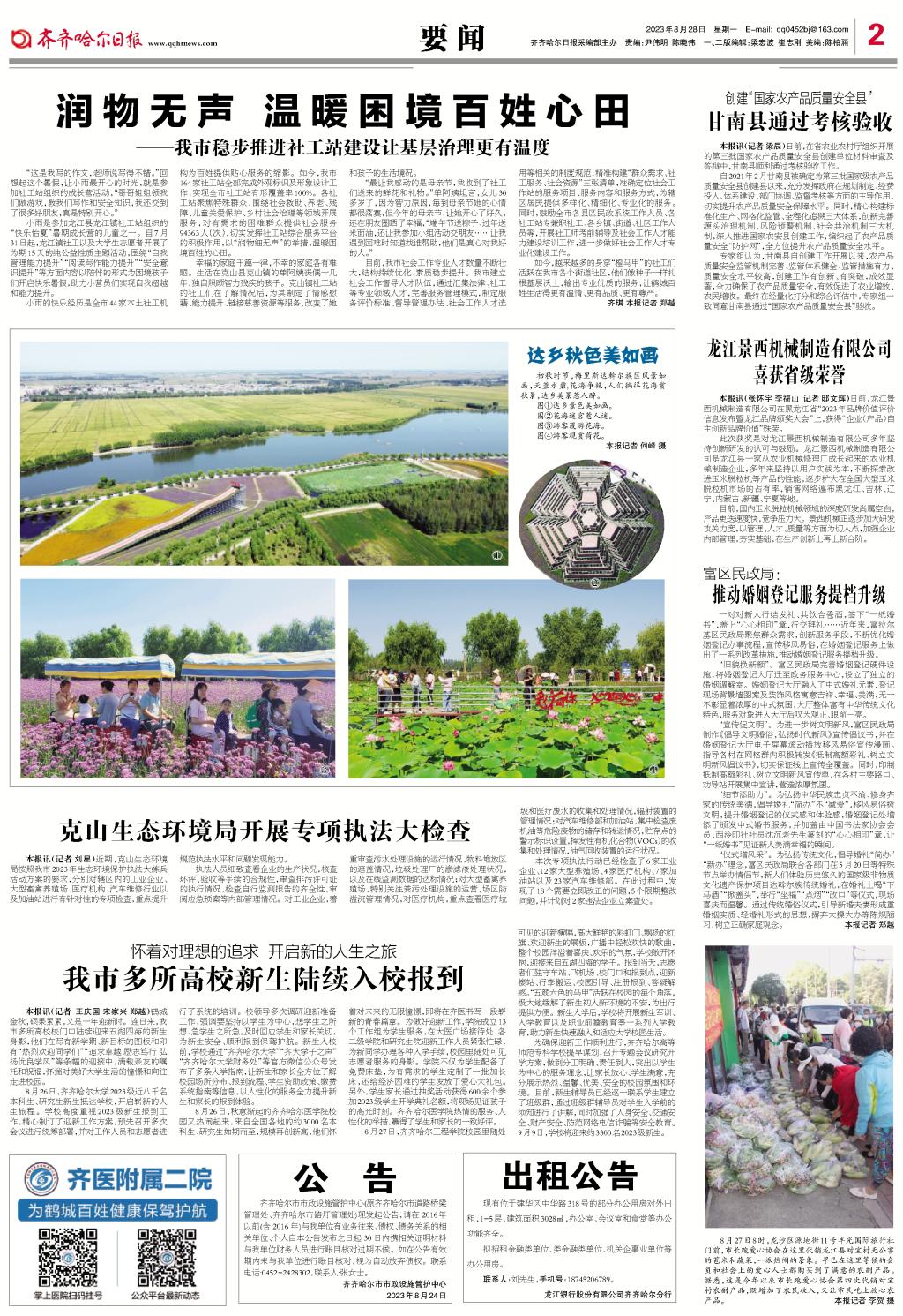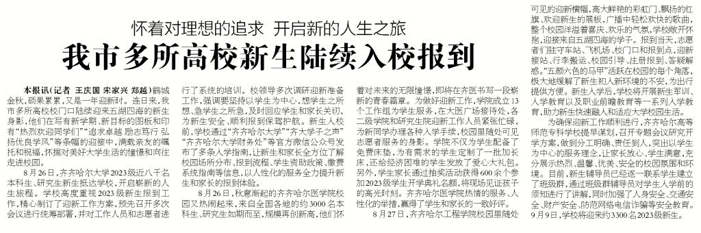 齐齐哈尔日报要闻版报道我校本科新生开学消息
