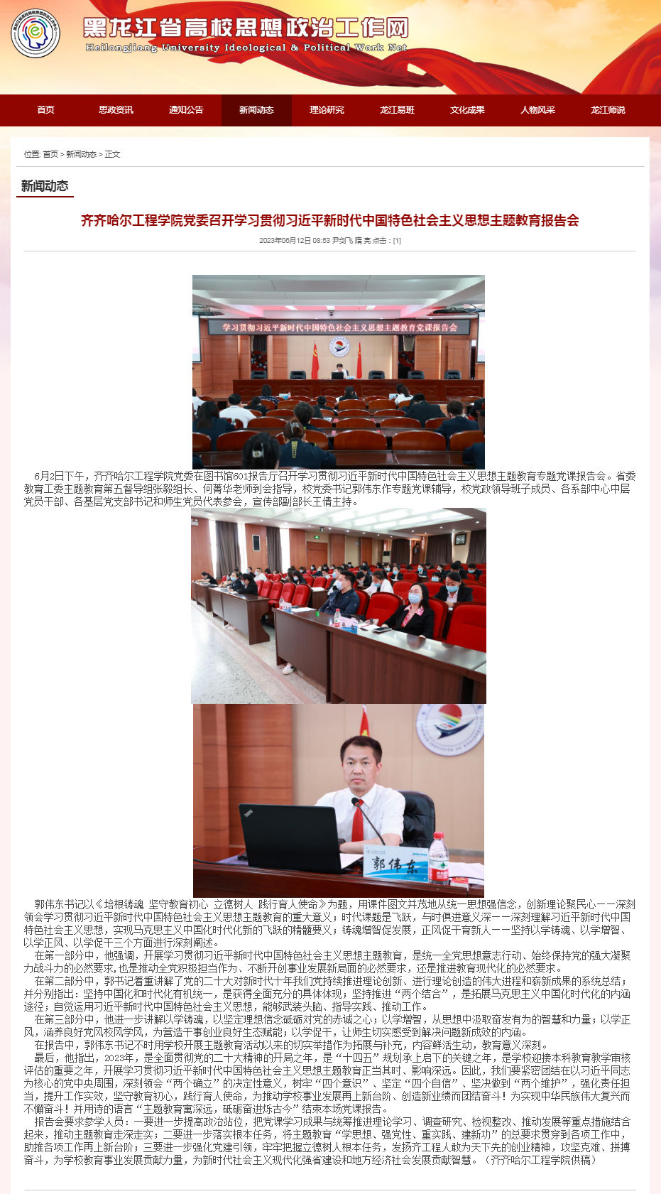 黑龙江省高校思想政治工作网:齐齐哈尔工程学院党委召开学习贯彻习近平新时代中国特色社会主义思想主题教育报告会