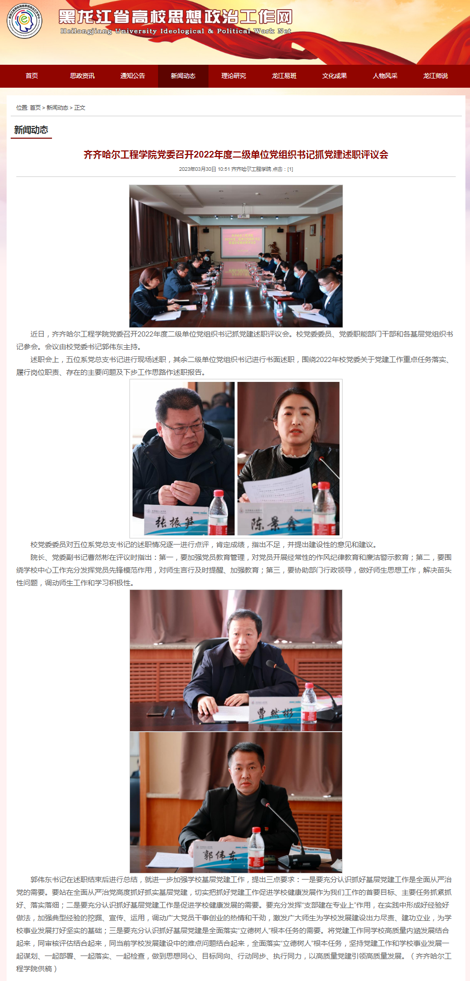 黑龙江省高校思想政治工作网:齐齐哈尔工程学院党委召开2022年度二级单位党组织书记抓党建述职评议会