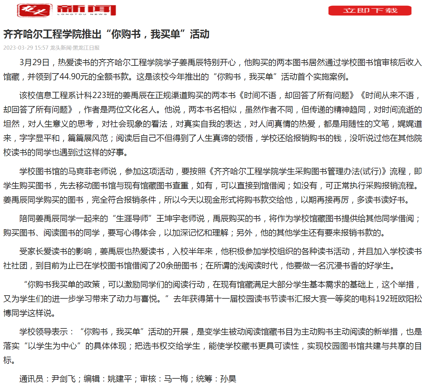 龙头新闻:齐齐哈尔工程学院推出“你购书,我买单”活动