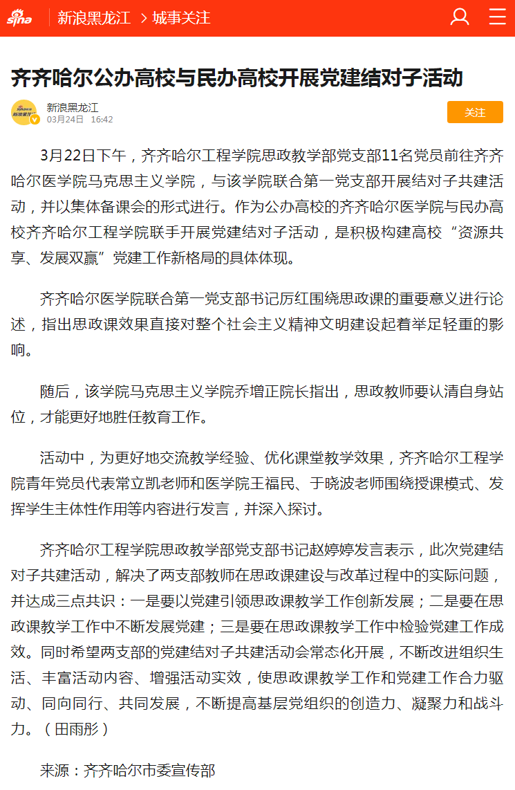新浪网:齐齐哈尔公办高校与民办高校开展党建结对子活动