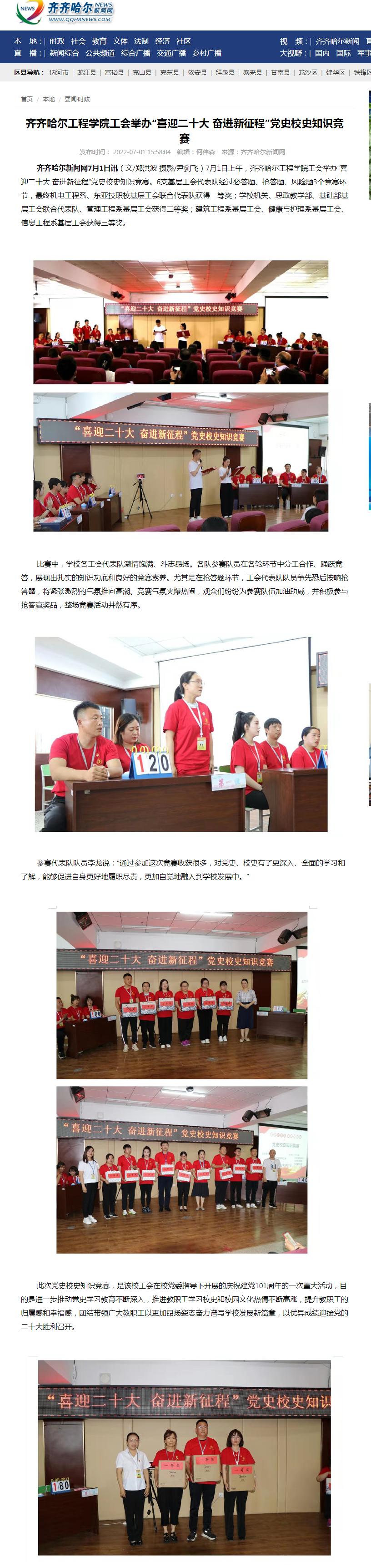 齐齐哈尔新闻网:齐齐哈尔工程学院工会举办“喜迎二十大 奋进新征程”党史校史知识竞赛