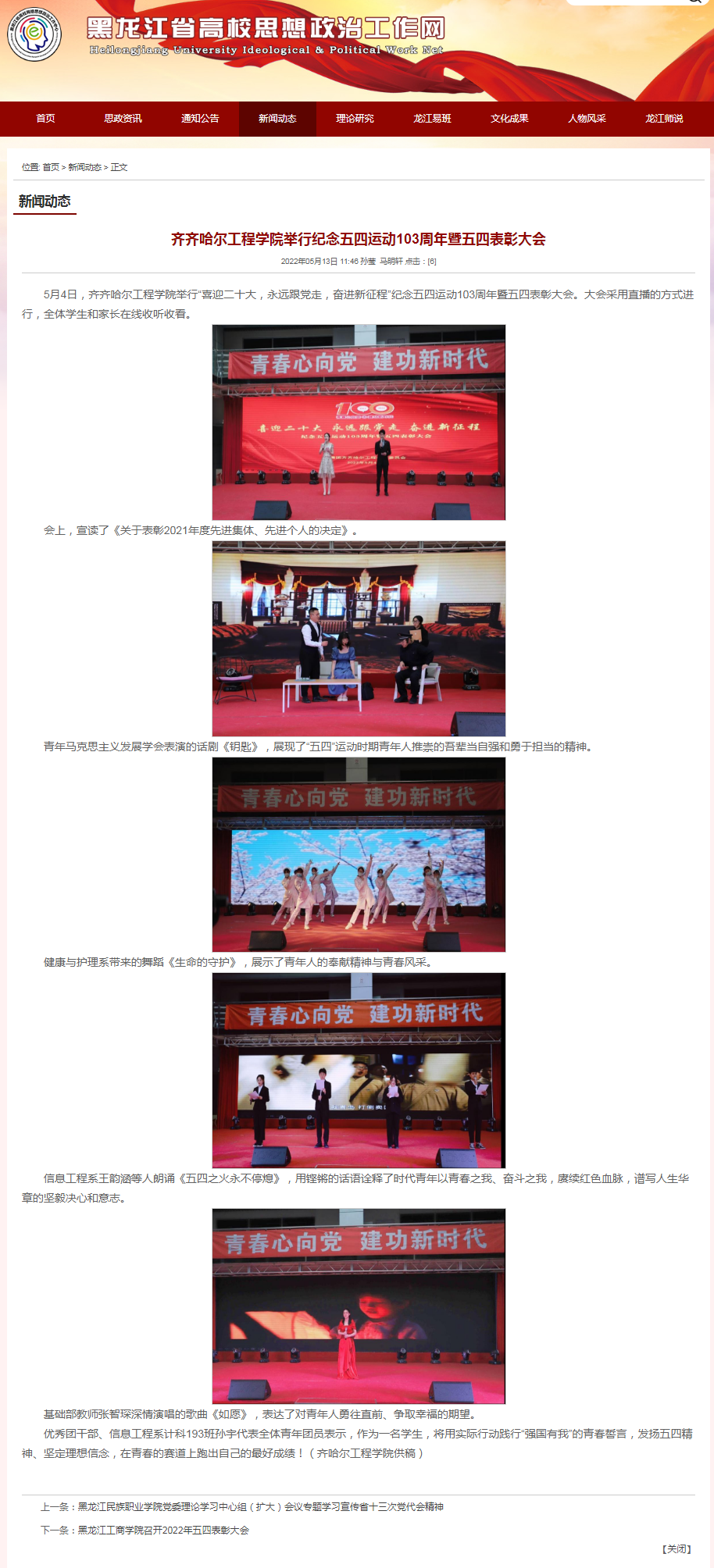 黑龙江省高校思想政治工作网:齐齐哈尔工程学院举行纪念五四运动103周年暨五四表彰大会