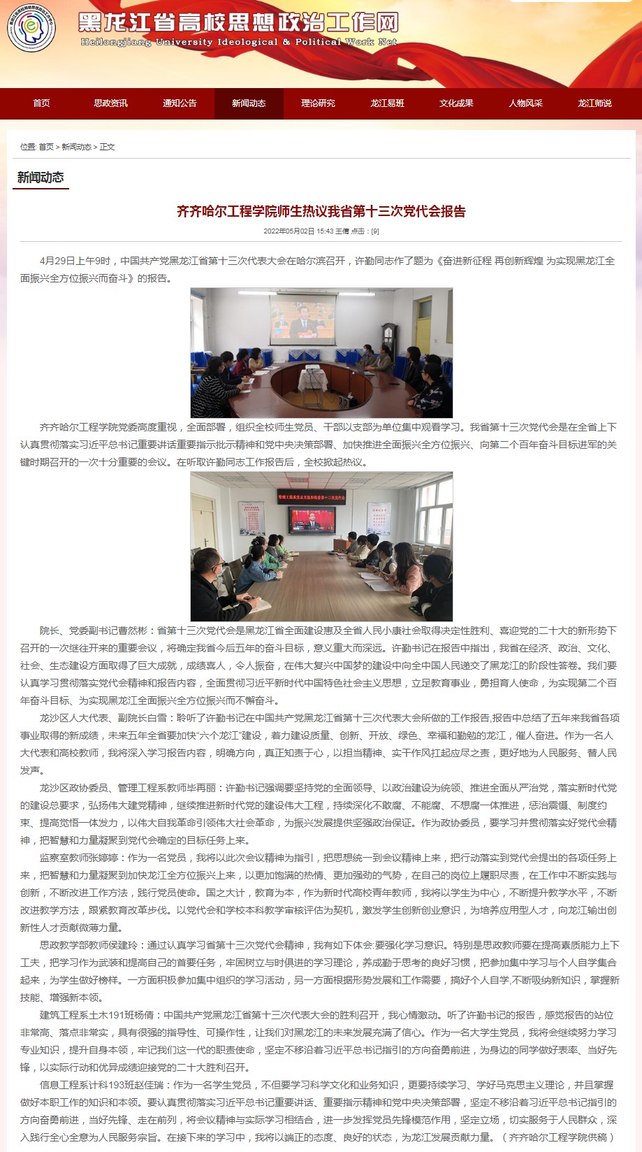 黑龙江省高校思想政治工作网:齐齐哈尔工程学院师生热议我省第十三次党代会报告