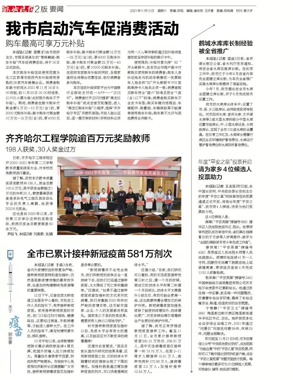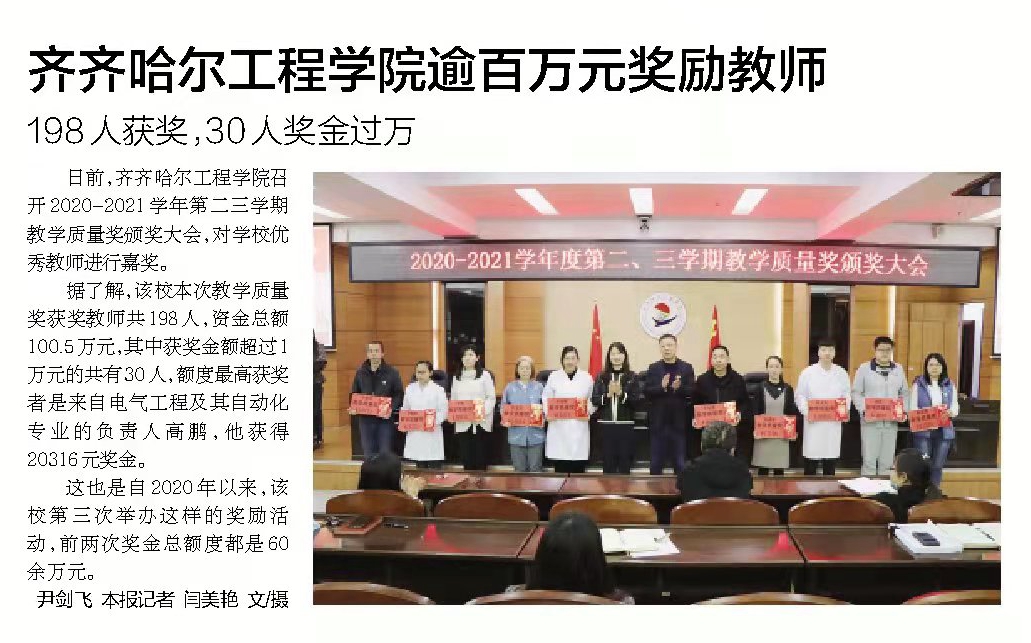 鹤城晚报:齐齐哈尔工程学院逾百万奖励教师