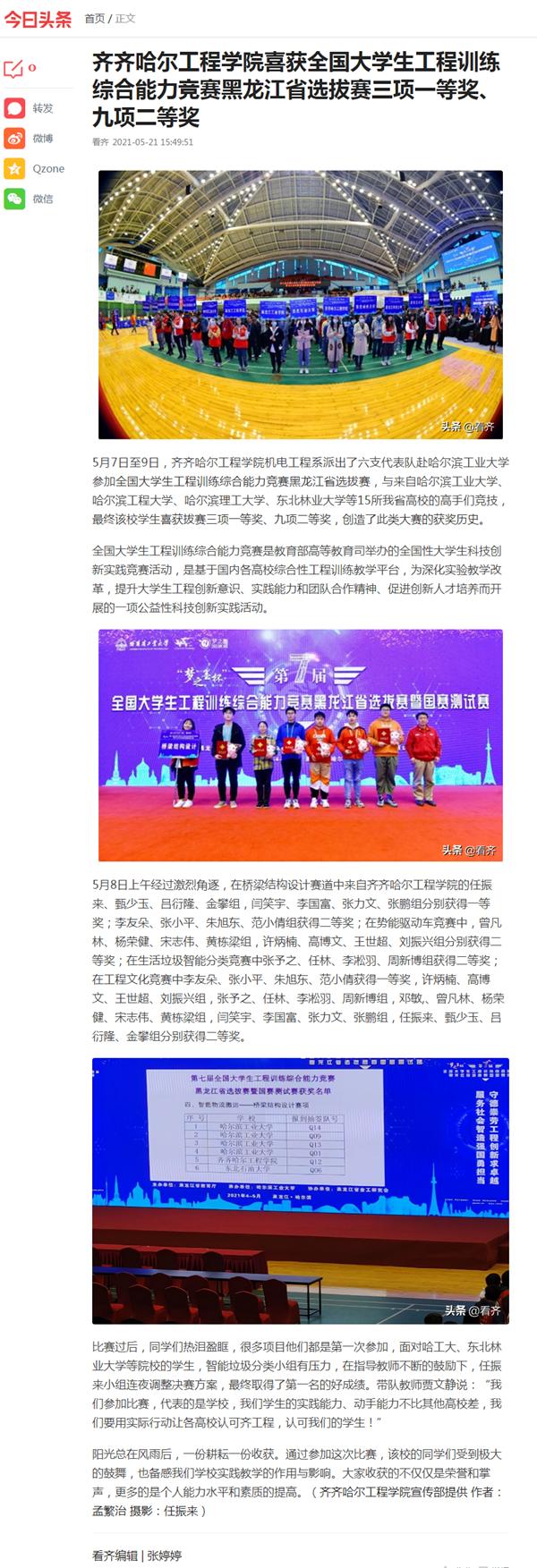今日头条:齐齐哈尔工程学院喜获全国大学生工程训练综合能力竞赛黑龙江省选拔赛三项一等奖、九项二等奖