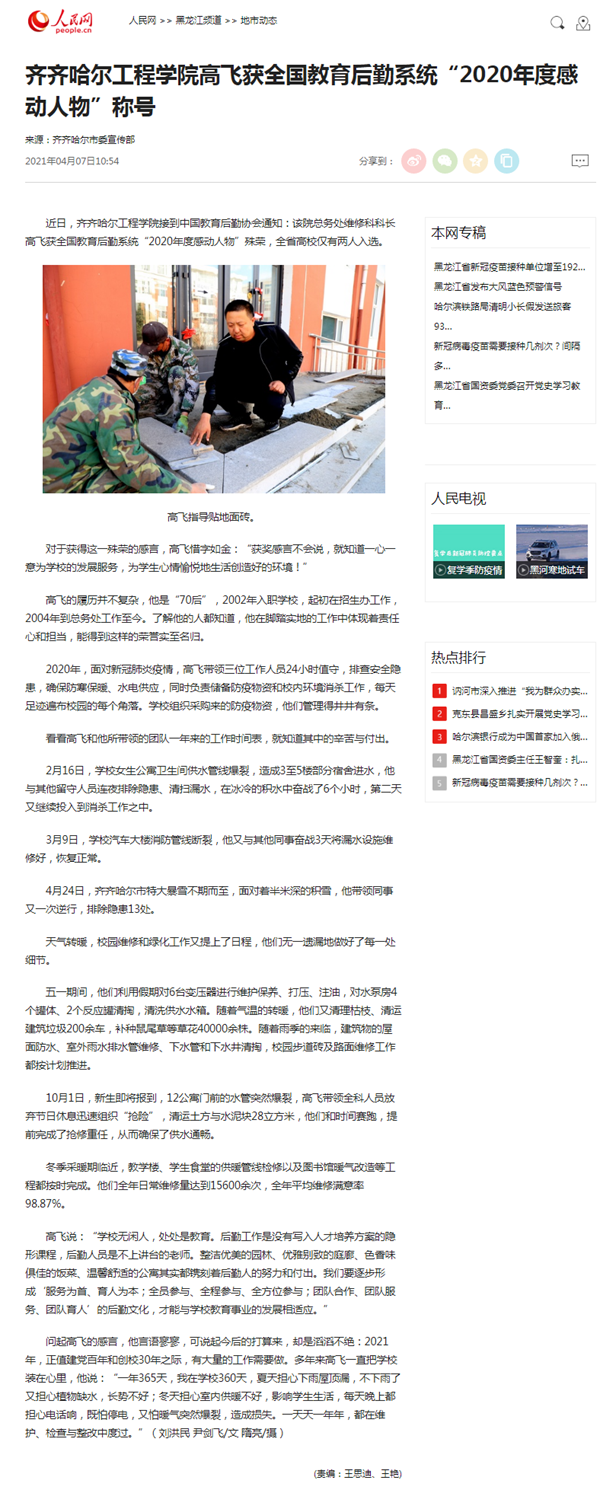 人民网:齐齐哈尔工程学院高飞获全国教育后勤系统“2020年度感动人物”称号