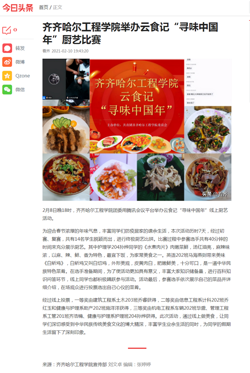 今日头条:齐齐哈尔工程学院举办云食记“寻味中国年”厨艺比赛
