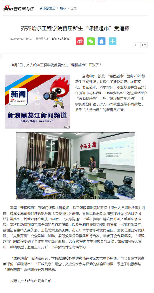 新浪黑龙江:齐齐哈尔工程学院首届新生“课程超市”受追捧
