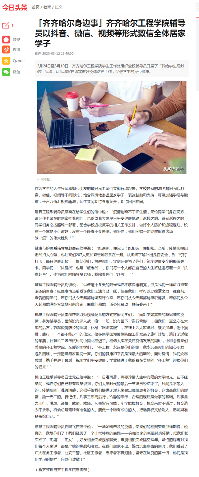 今日头条《齐齐哈尔身边事》:齐齐哈尔工程学院辅导员以抖音、微信、视频等形式致信全体居家学子