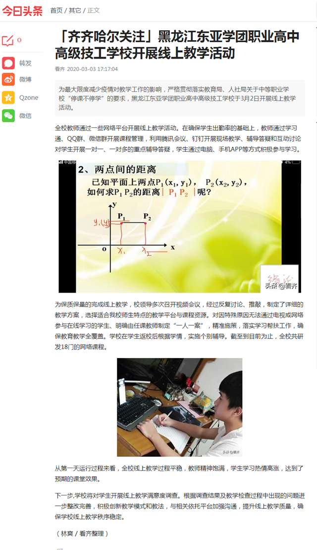 今日头条《齐齐哈尔关注》:黑龙江东亚学团职业高中高级技工学校开展线上教学活动