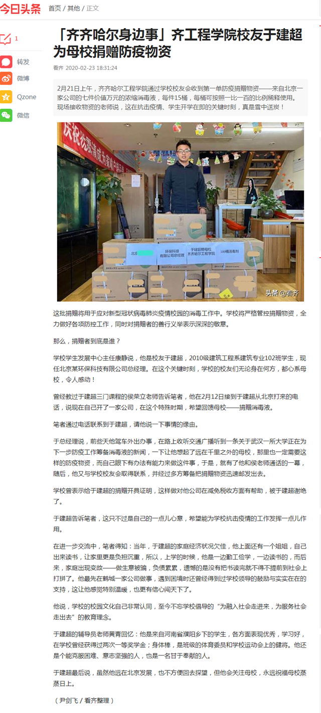 今日头条《齐齐哈尔身边事》:齐工程学院校友于建超为母校捐赠防疫物资