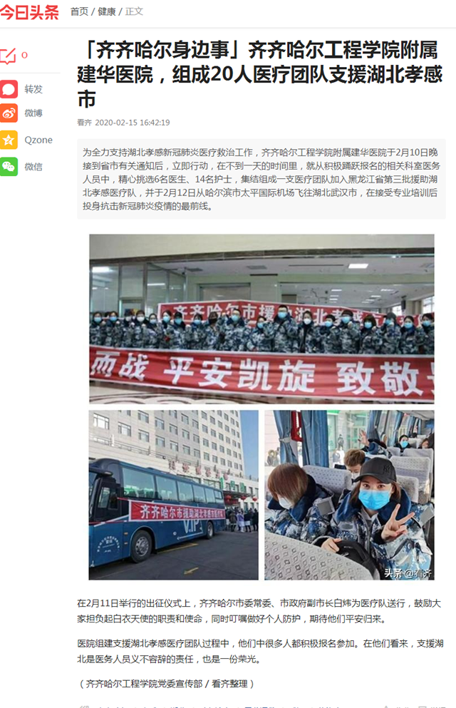 今日头条《齐齐哈尔身边事》:齐齐哈尔工程学院附属建华医院,组成20人医疗团队支援湖北孝感市