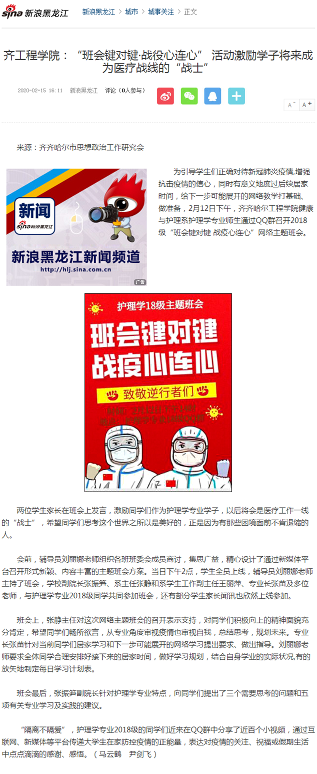 新浪网:齐工程学院:“班会键对键·战役心连心” 活动激励学子将来成为医疗战线的“战士”