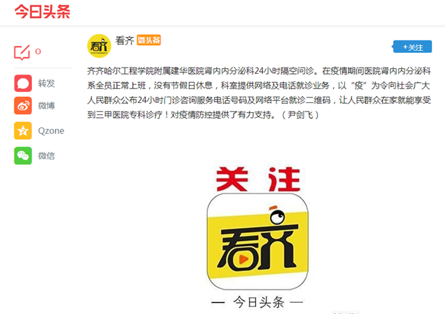 看齐微头条:齐齐哈尔工程学院附属建华医院肾内内分泌科24小时隔空问诊