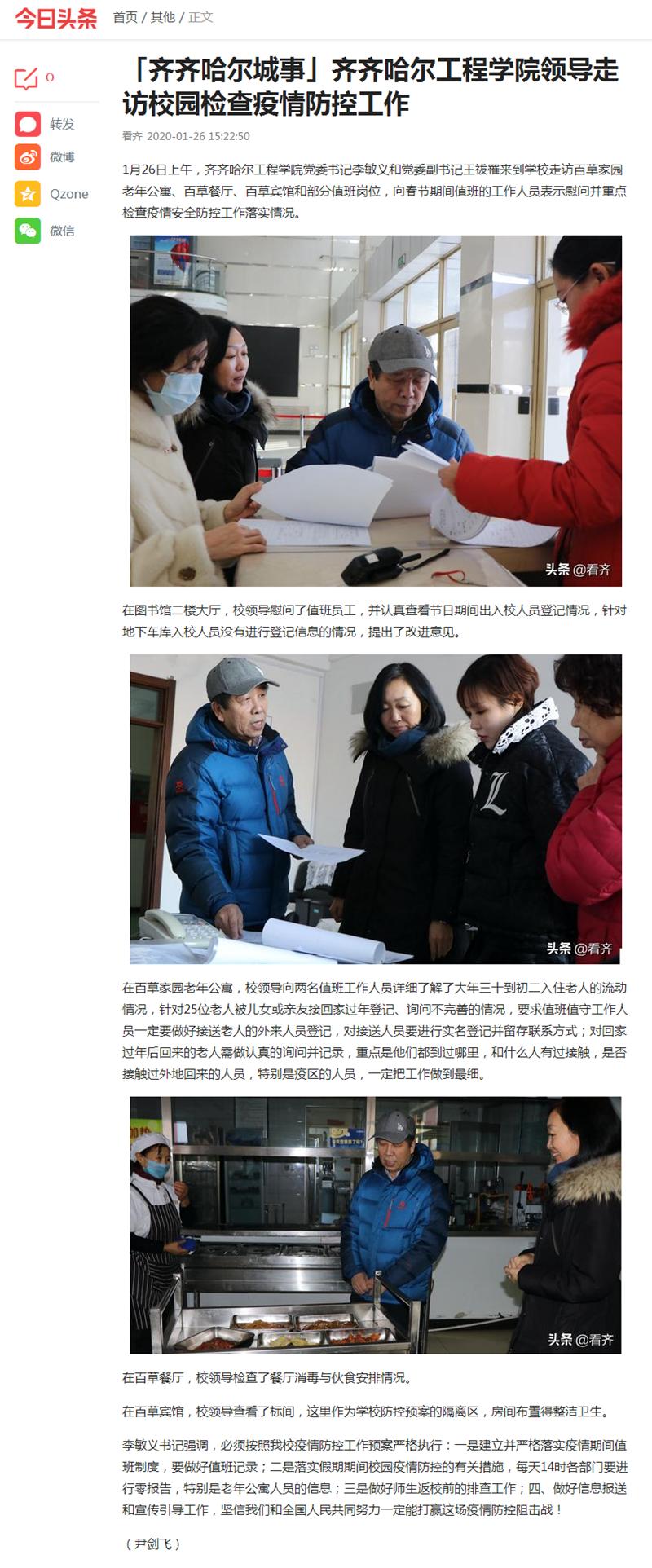 今日头条《齐齐哈尔城事》:齐齐哈尔工程学院领导走访校园检查疫情防控工作
