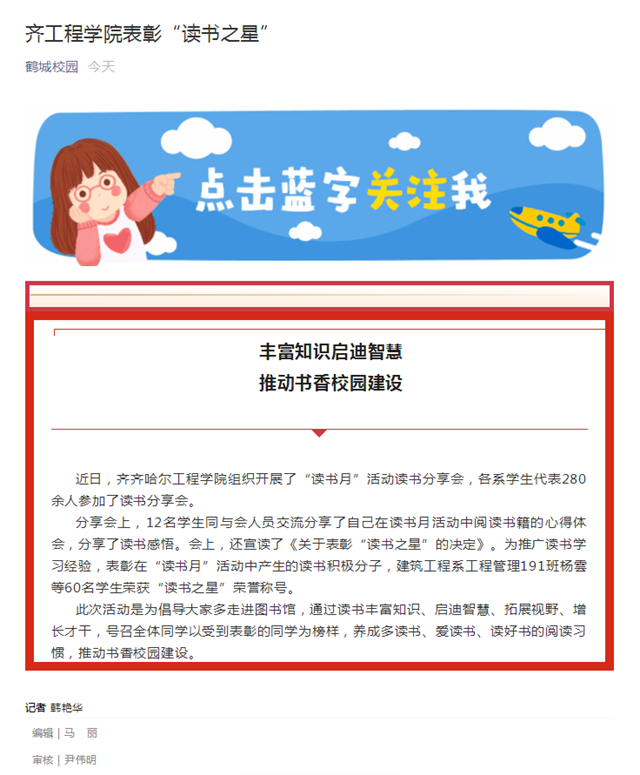 鹤城校园:齐工程学院表彰“读书之星”