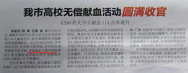 鹤城晚报:我市高校无偿献血活动圆满收官