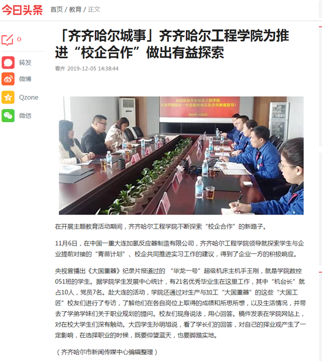 今日头条《齐齐哈尔城事》:齐齐哈尔工程学院为推进“校企合作”做出有益探索