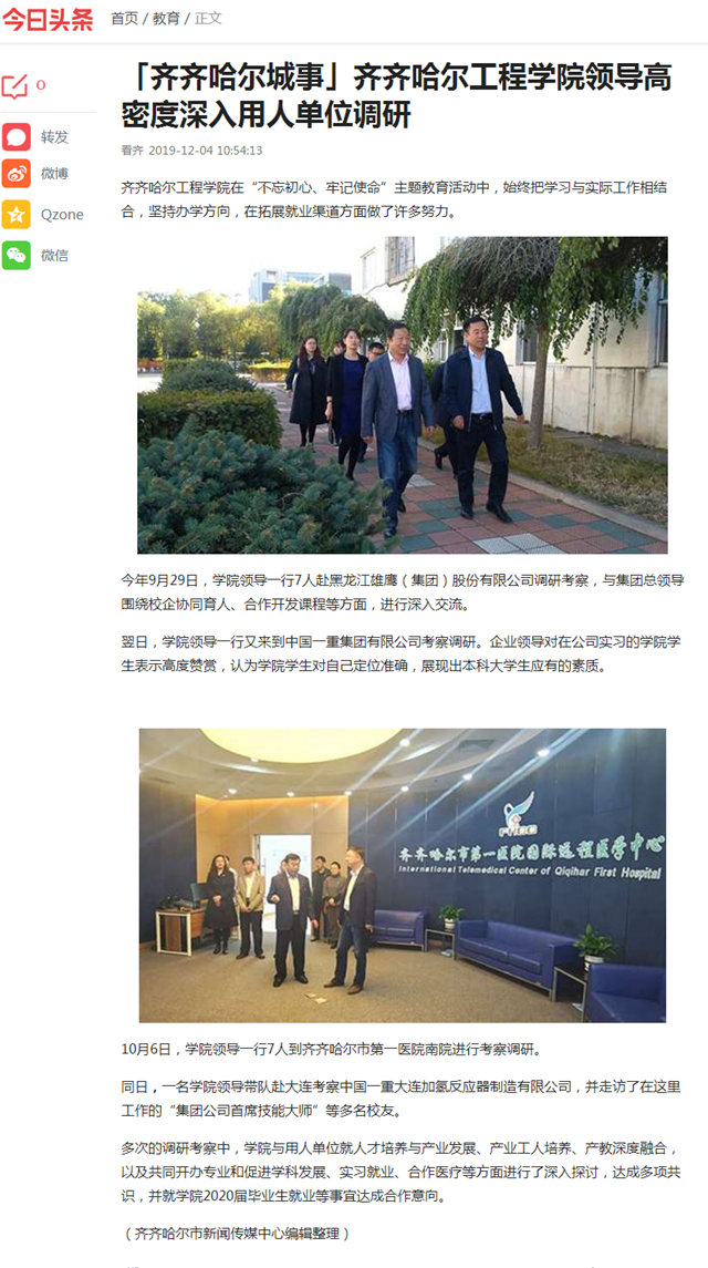 今日头条《齐齐哈尔城事》:齐齐哈尔工程学院领导高密度深入用人单位调研