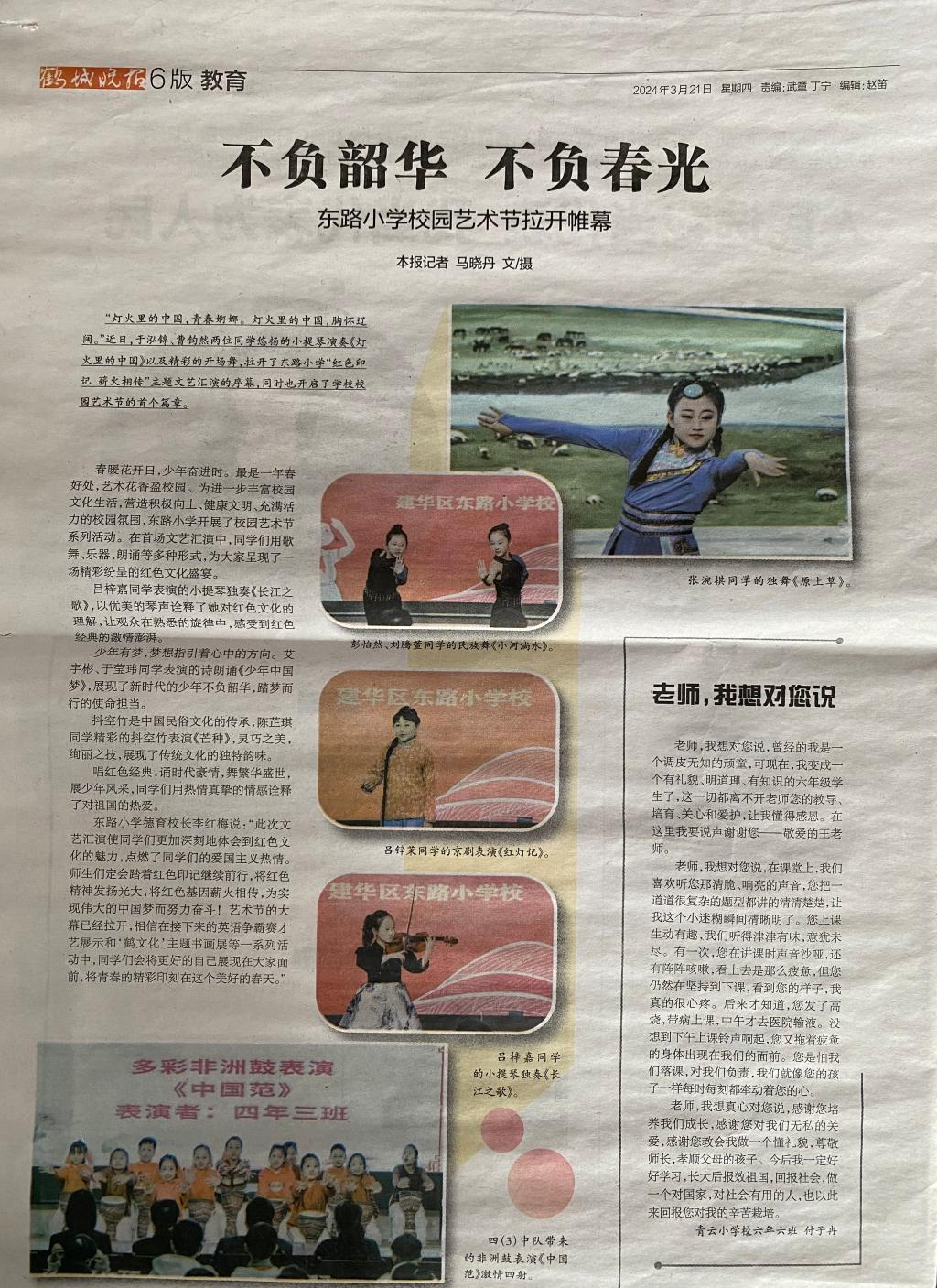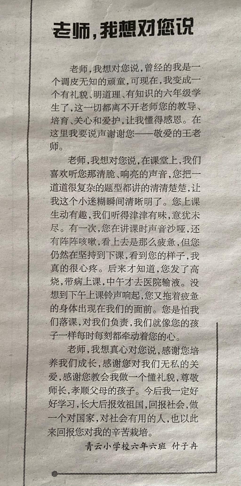 《鹤城晚报》发表子弟学校学生作文《老师,我想对您说》