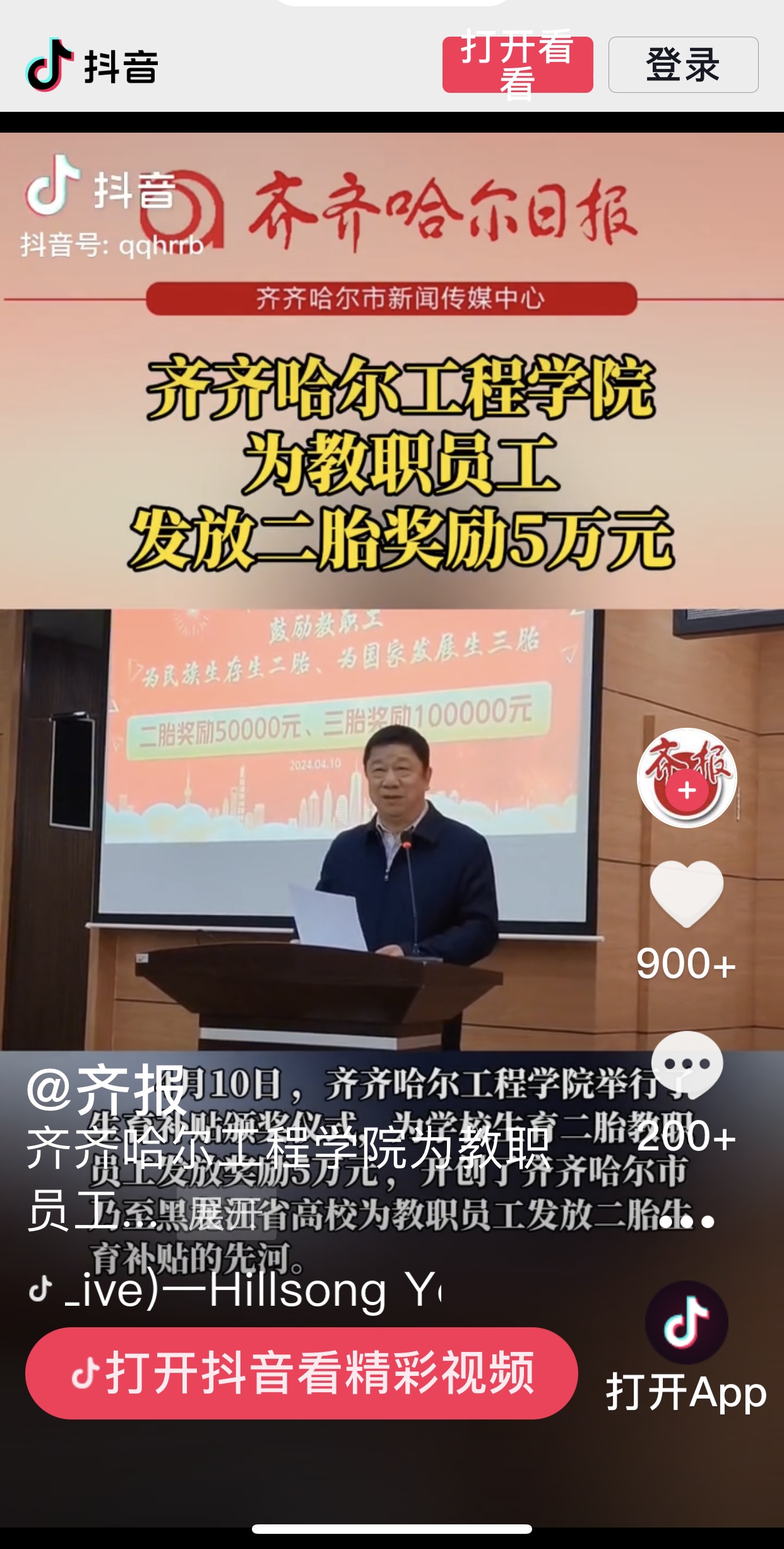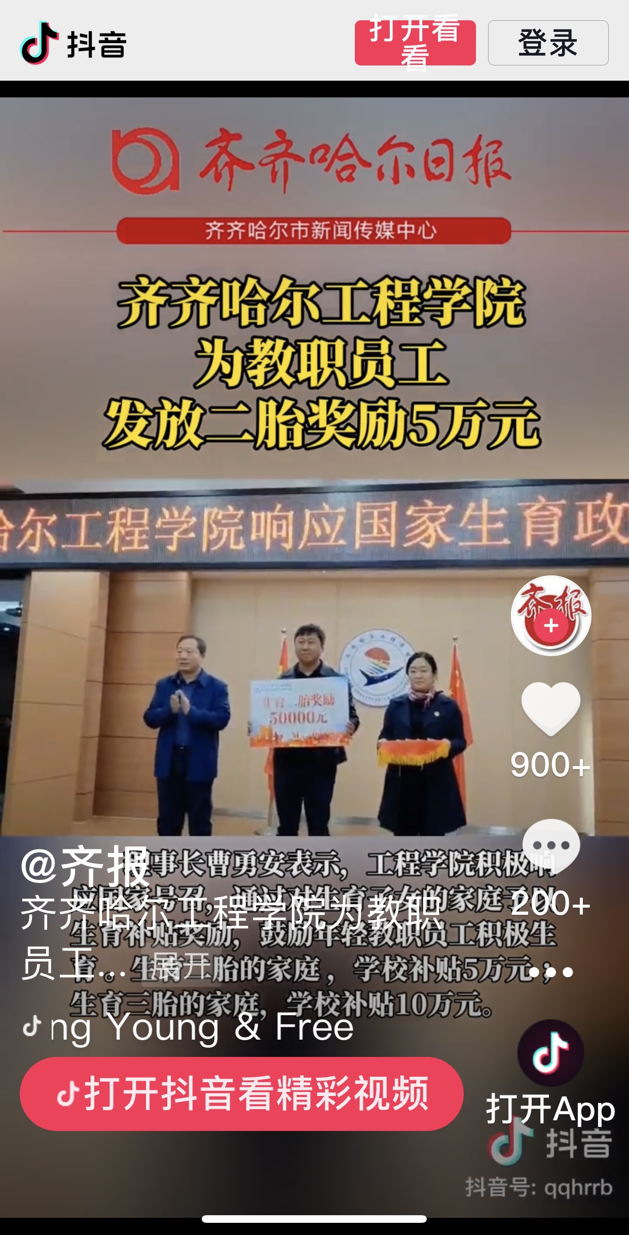 《抖音.齐报》播出齐齐哈尔工程学院为教职员工发放二胎奖励5万元视频