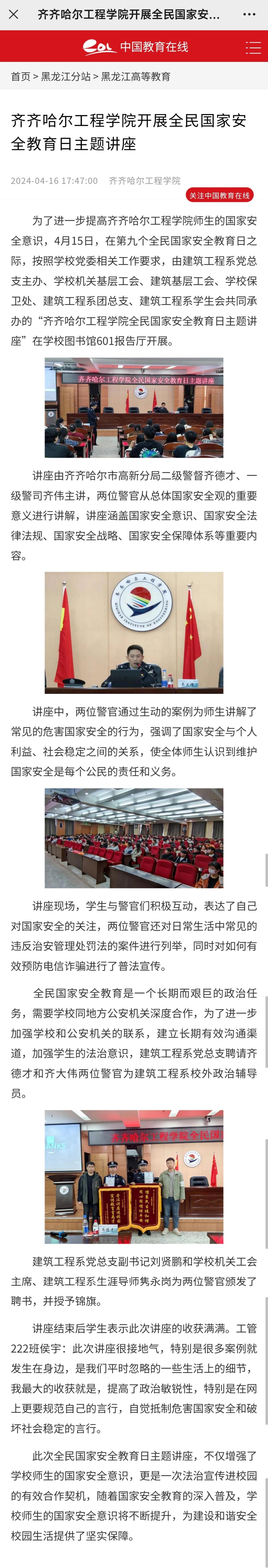 《中国教育在线》发表齐齐哈尔工程学院开展全民国家安全教育日主题讲座