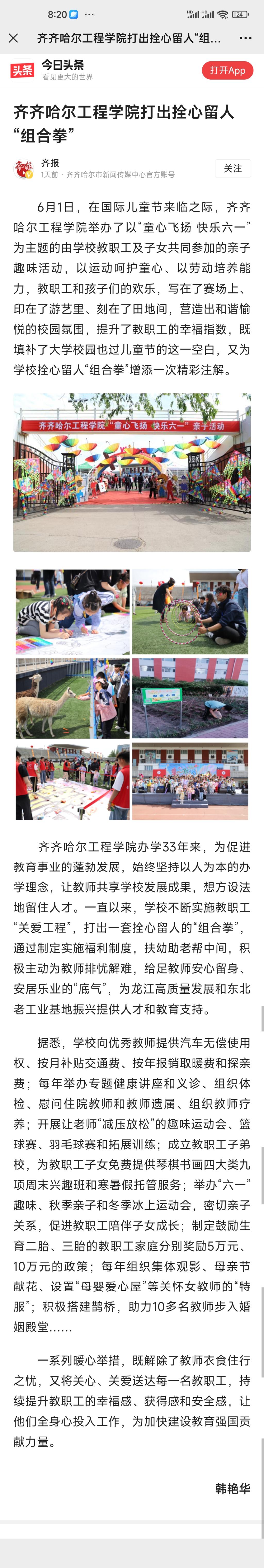 《今日头条》报道齐齐哈尔工程学院打出拴心留人“组合拳”