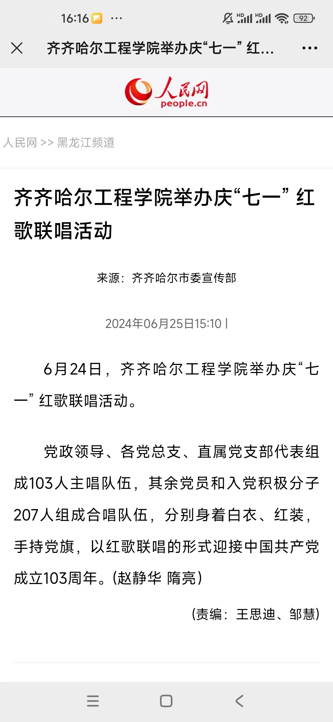 《人民网》报道齐齐哈尔工程学院举办庆“七一”红歌联唱活动