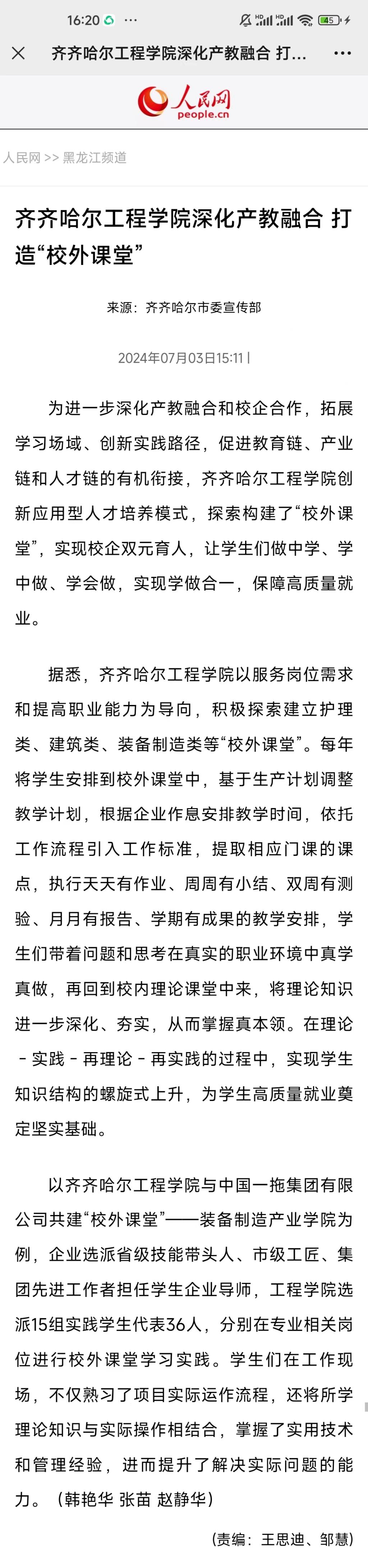 《人民网》报道齐齐哈尔工程学院深化产教融合 打造“校外课堂”
