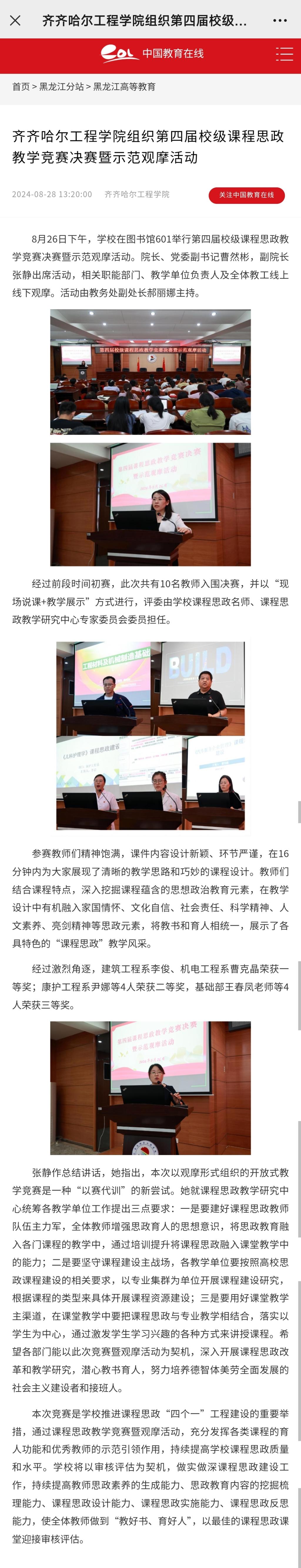 《中国教育在线》报道齐齐哈尔工程学院组织第四届校级课程思政教学竞赛决赛暨示范观摩活动