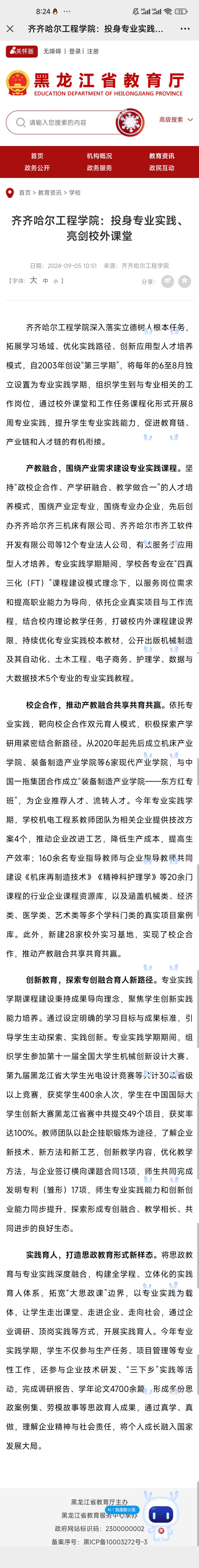 《黑龙江省教育厅》报道齐齐哈尔工程学院:投身专业实践、亮剑校外课堂